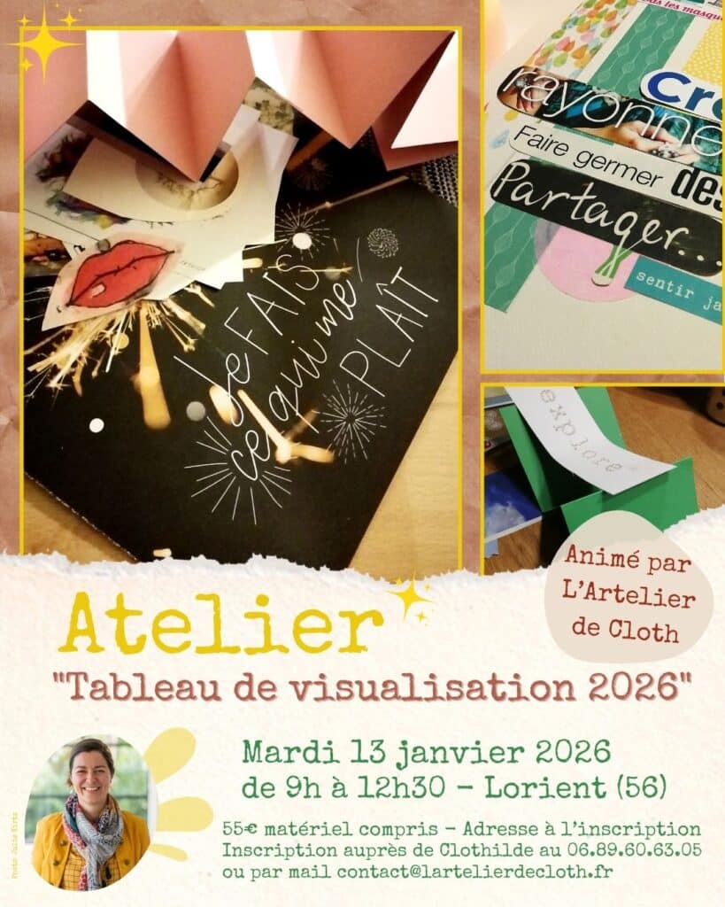 Clothilde Gager de l’Artelier de Cloth propose, comme l’année dernière, un atelier pour réaliser son tableau de visualisation 2026. L’atelier est guidé par ses soins pour pouvoir orienter les objectifs du tableau.